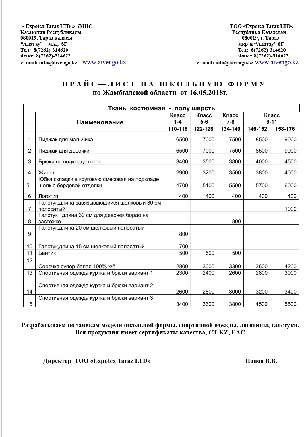27 июнь 2018 40 1 2 3 4 5 П Р А Й С — Л И С Т Н А Ш К О Л Ь Н У Ю Ф О Р М У по Жамбылскойобласти от 16.05.2018г.
