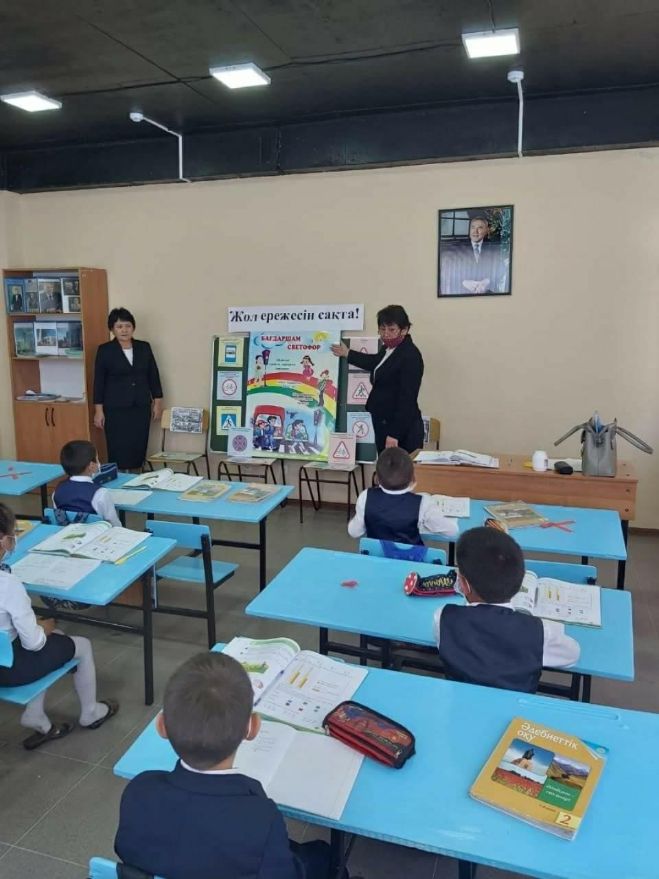 "Қауіпсіз мектеп ортасы" Республикалық акциясы аясында "Жолда жүру ережесі" тақырыбында сынып оқушыларына дәріс оқылуда.