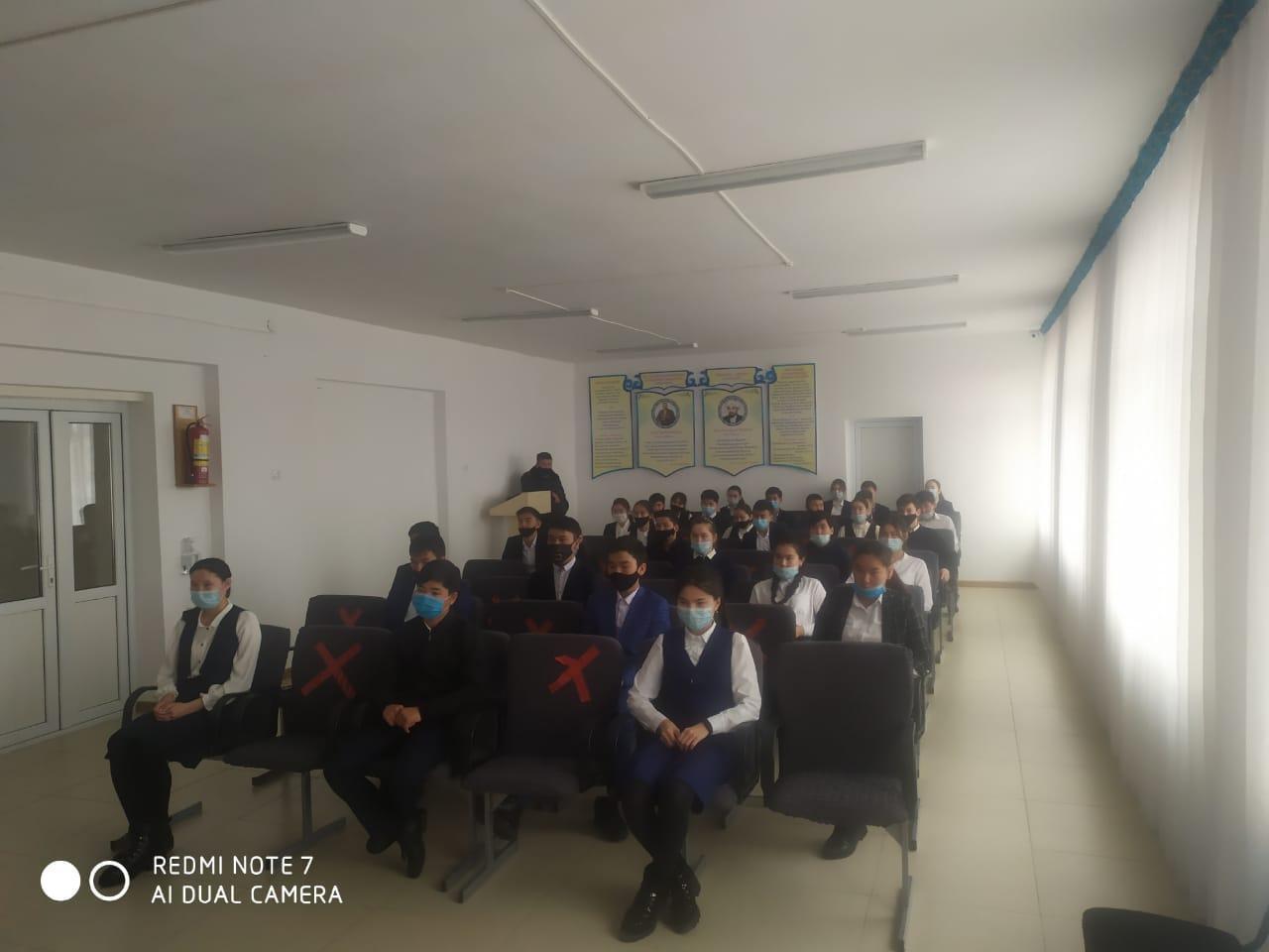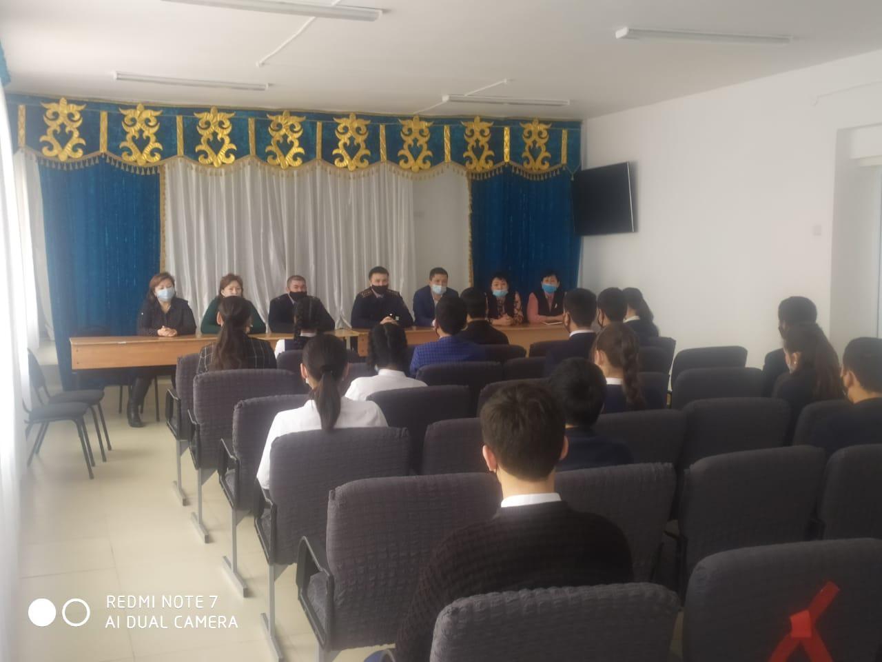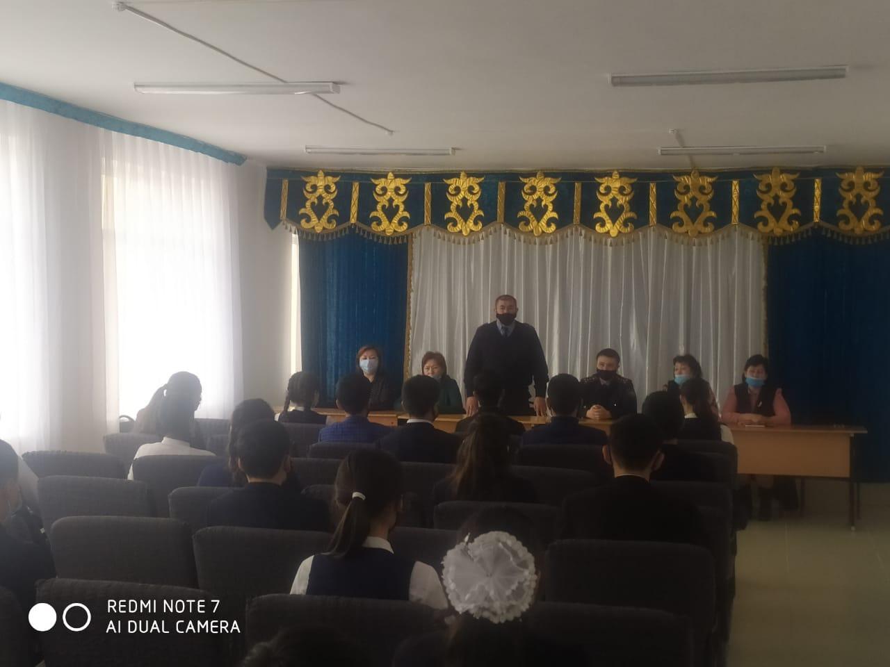 Шоқан Уәлиханов атындағы орта мектебінде психологиялық кеңес беру айлығында мектеп психологы Байғазиева Дина Шубаевна 9-11сыныптар бойынша "Жасөспірім және заң" тақырыбында арнайы мамандармен кездесу ұйымдастырылды. Мектеп инспекторы Б.Досымов пен ИДН инспекторлары қатысты.