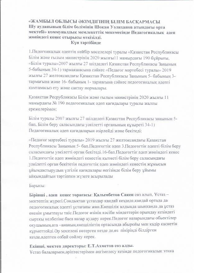 Шу ауданы «Шоқан Уәлиханов атындағы орта мектебі» КММ-де 2022 жылдың 21 қыркүйек күні Қазақстан Республикасы Білім және ғылым министрлігінің 2020 жылғы 11 мамырдағы № 190 бұйрығы «Білім туралы» 2007 жылғы 27 шілдедегі Қазақстан Республикасы Заңының 5- бабының 34-1) тармақшасына сәйкес , «Педагог мәртебесі туралы »2019 жылғы 27 желтоқсандағы Қазақстан Республикасы Заңының 5- бабының 3-тармағына және 16- бабының 1- тармағына сәйкес мектепішілік педагогикалық әдеп жөніндегі кеңестің ұйымдастырумен мектеп ұжымымен отырысы өткізілді. Отырыста педагогикалық әдеп қағидаттарына назар аударылып, педагогикалық әдепті бұзуға ықпал ететін себептер мен жағдаяттар талданды.