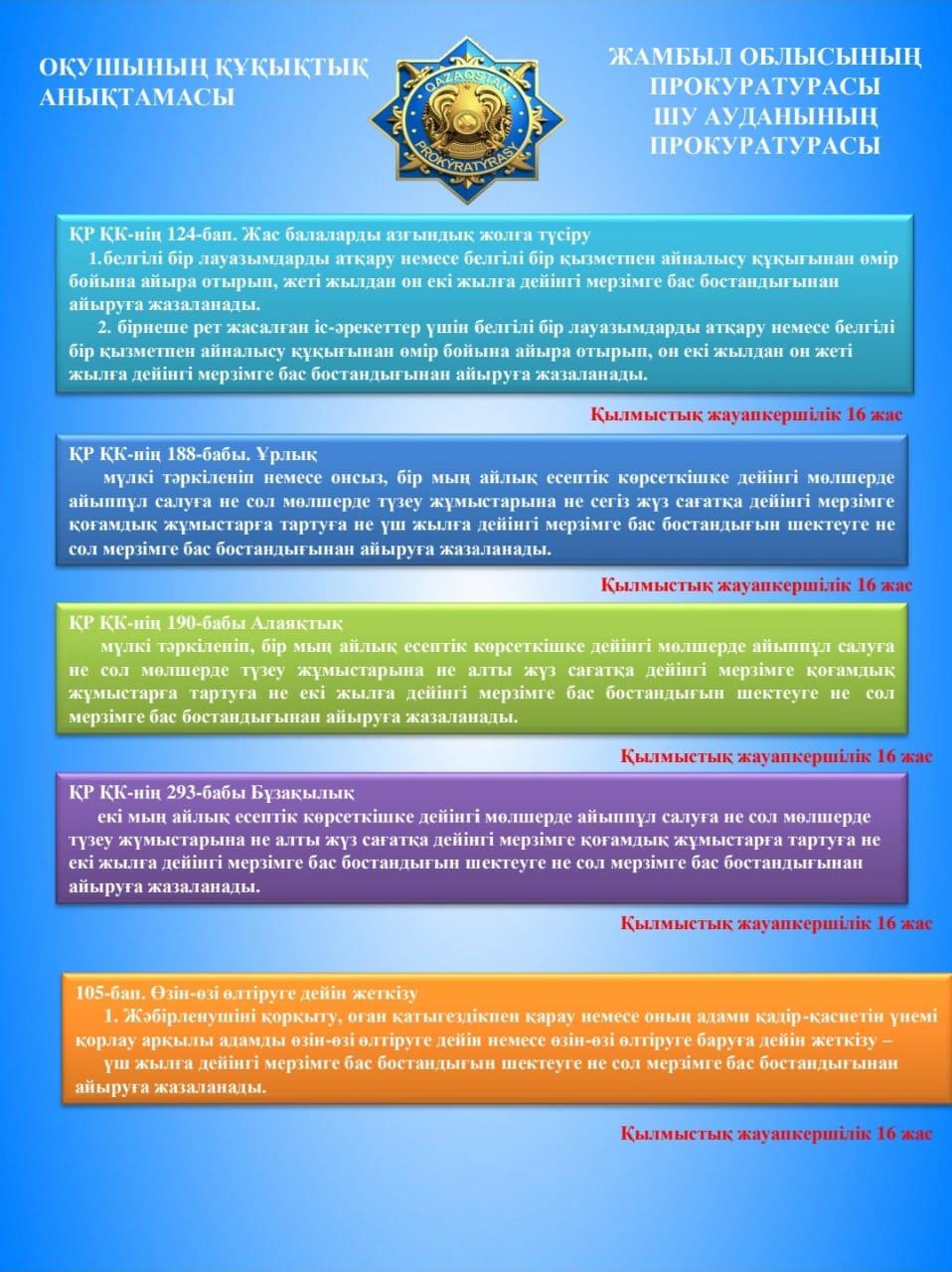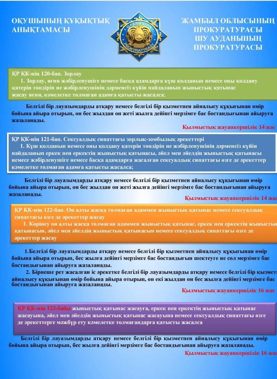 Шу ауданы білім бөлімінің, Шоқан Уәлиханов атындағы орта мектебінің ата-аналары мен оқушыларына Құқық бұзушылықтың алдын алу мақсатында Жамбыл облысы прокуратурасының жолдаған "Оқушының құқықтық анықтамасы" чат арқылы жолданып, сынып жетекшілері тарапынан түсіндіру жұмыстары жүргізілді.