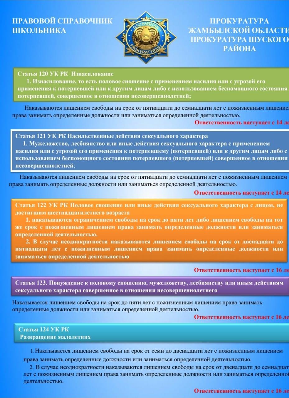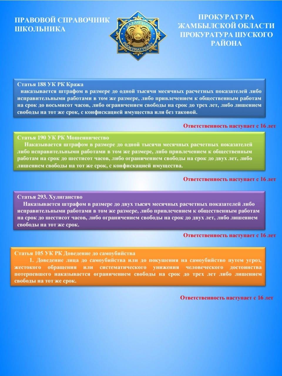 В целях профилактики правонарушений среди несовершеннолетних, на сайте школы,в родительских чатах средней школы имени Шокана Уалиханова был размещен Правовой справочник школьника, подготовленный Прокуратурой Жамбылской области