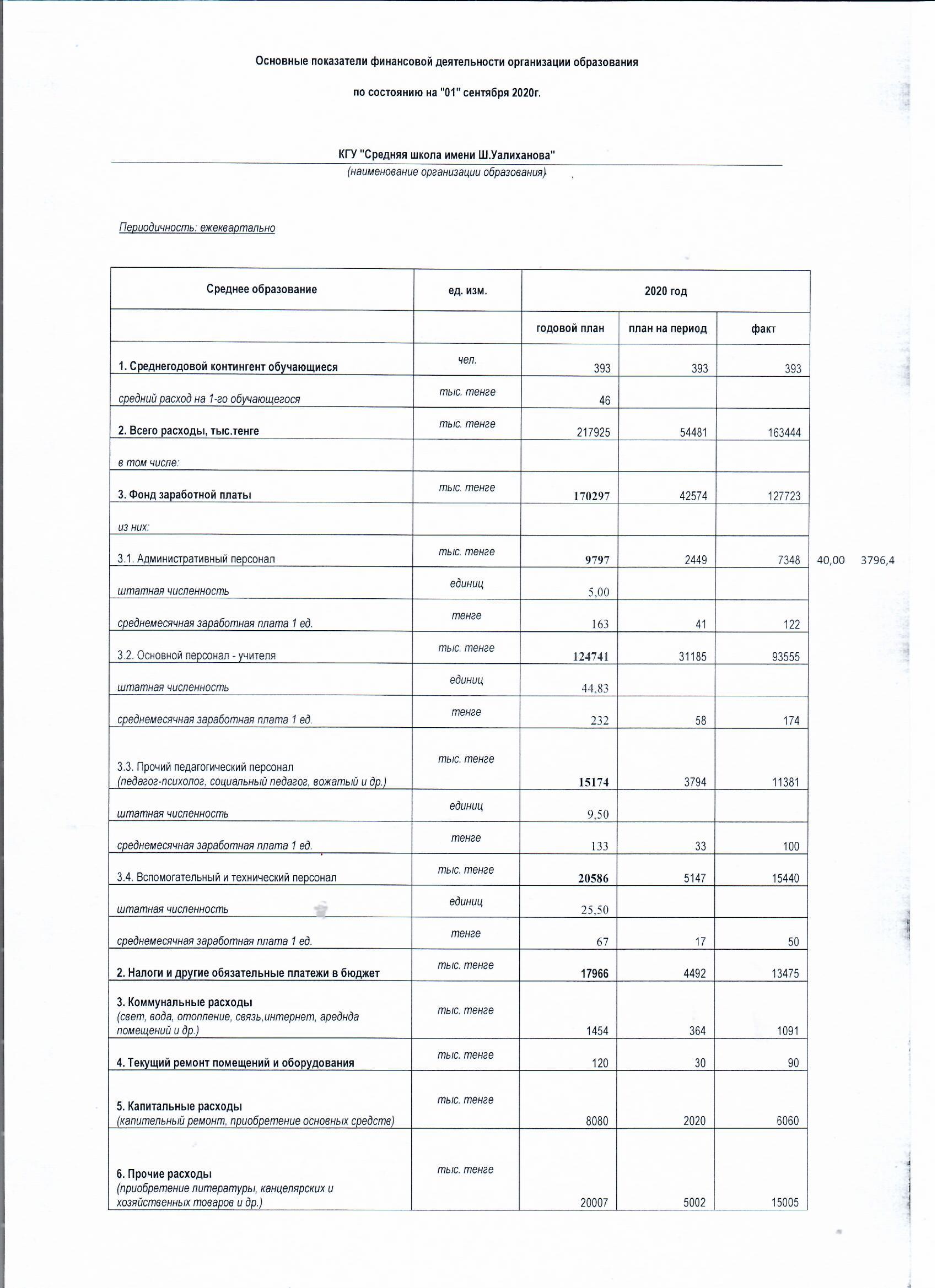 07 сентябрь 2020 0 1 2 3 4 5 Основные показатели финансовой деятельности организации образования по состоянию на "01" сентября 2020г.
