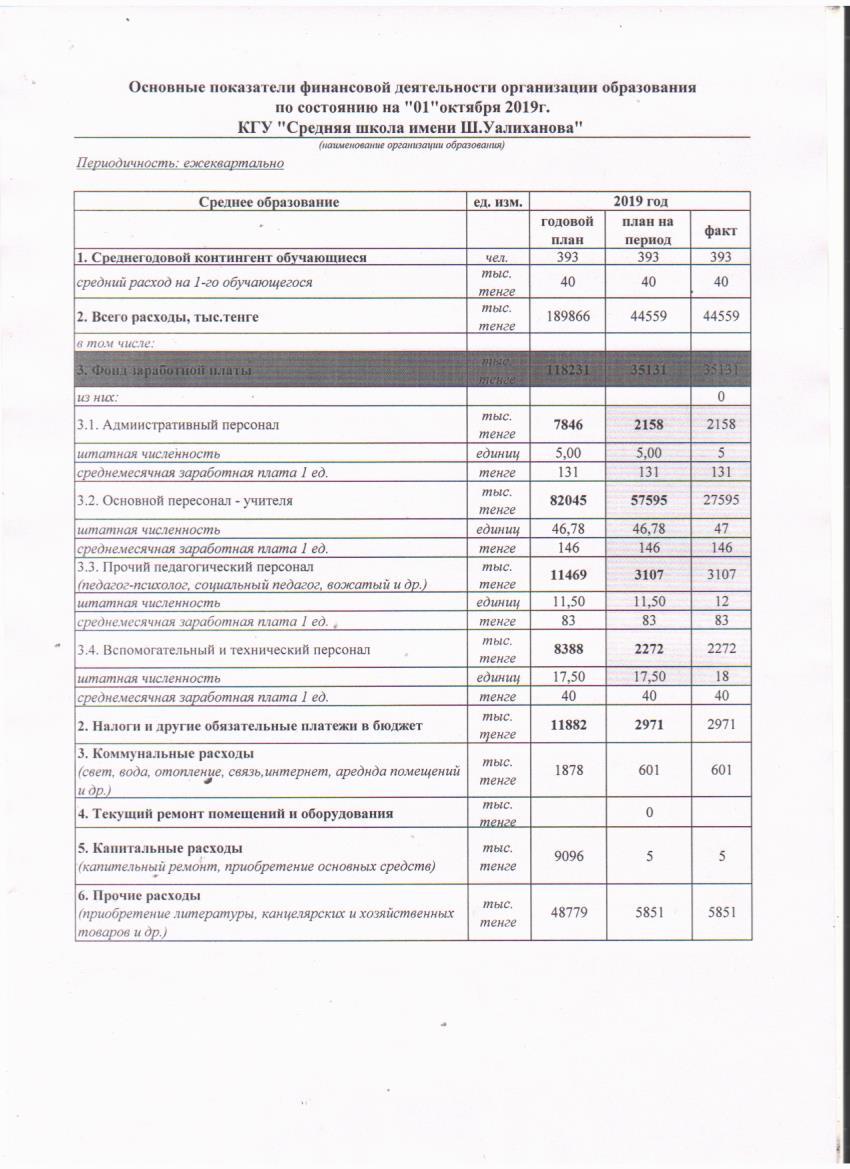 11 октябрь 2019 0 1 2 3 4 5 Основные показатели финансовой деятельности организации образования по состоянию на "01"октября 2019г.