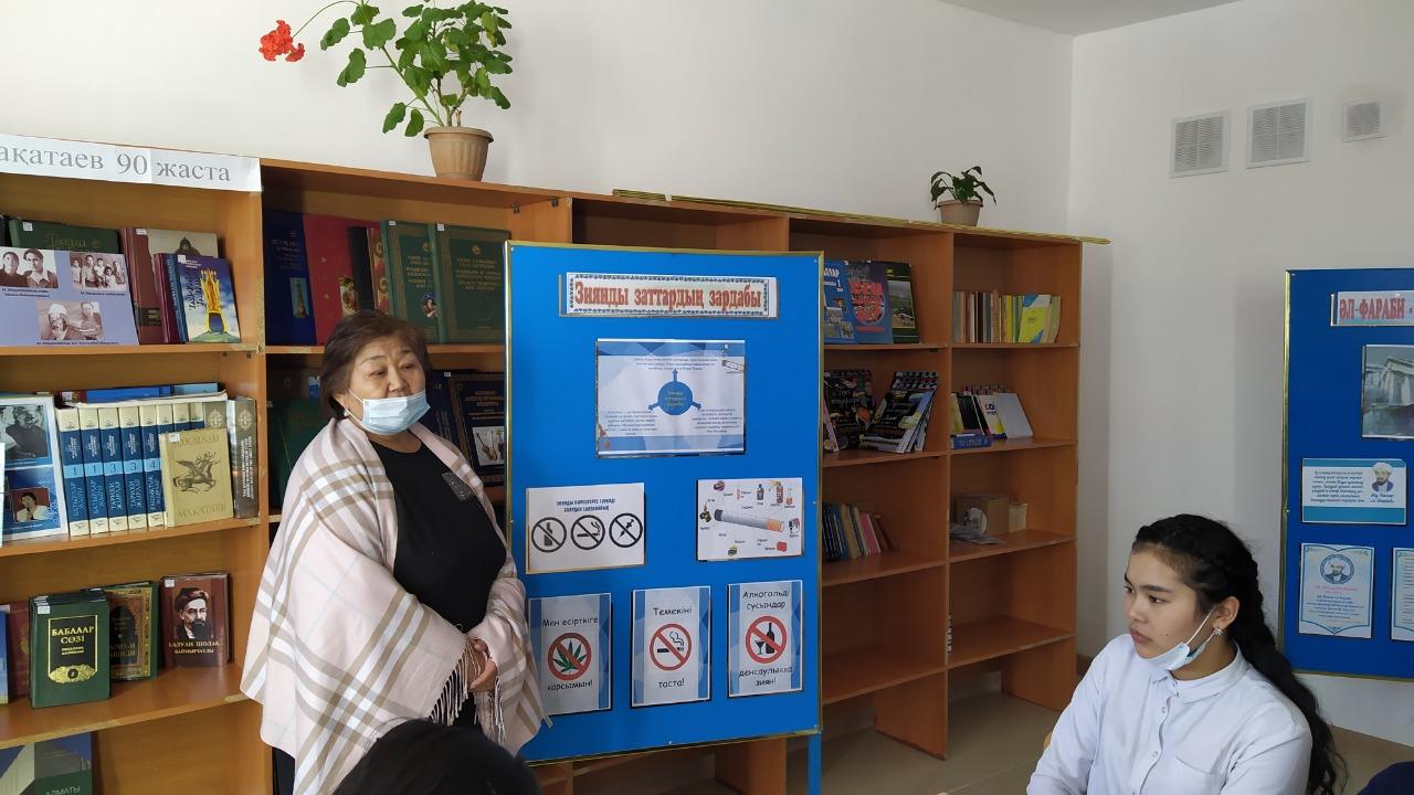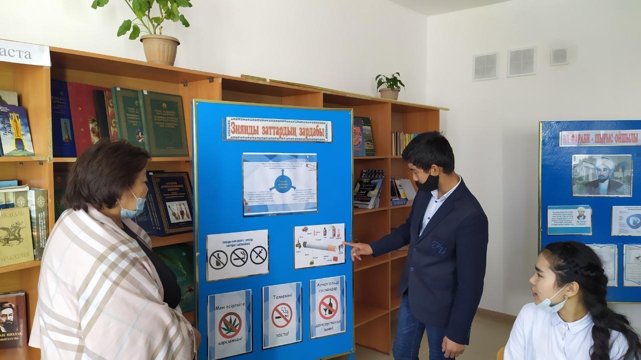 Шара барысында темекі, арақ, есірткі және басқа да зиянды заттар туралы кітапханашы әңгімелеп берді. «Зиянды заттардың зардабы» атты көрмеде есірткіден сақтануға, темекінің, арақтың зияны туралы кітаптар орналастырылды.