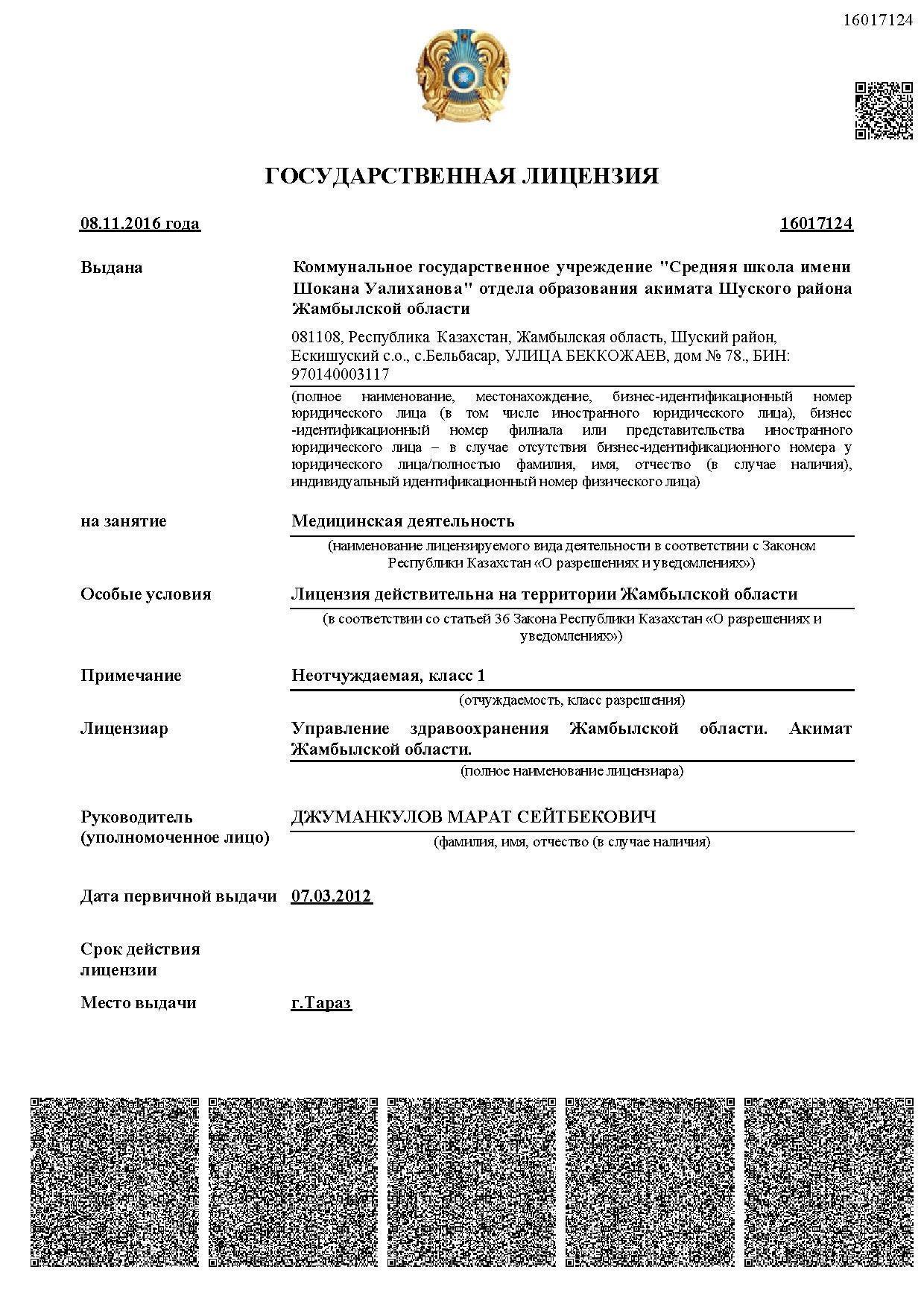 Лицензия » Ш.Уәлиханов атындағы орта мектеп